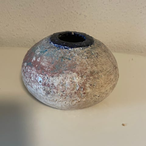 Keramik lampe med rund form, beige farve og væge. Lampen har en prop og en ekstra åbning, og bunden er uglaseret. Materialet er keramik, og designet er simpelt og funktionelt.
