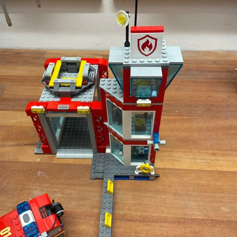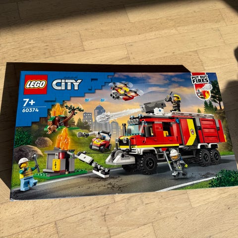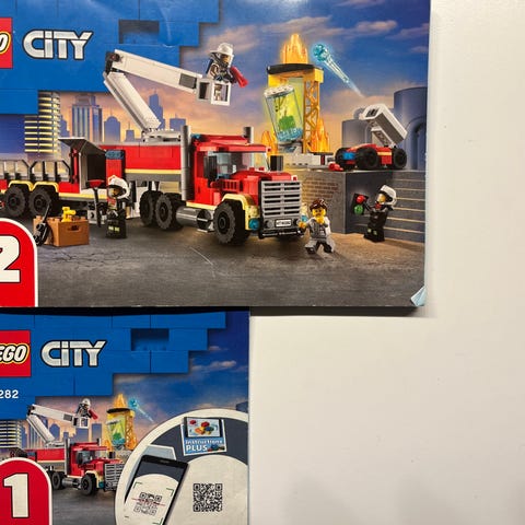 Hvad er der i æsken? – Alt, hvad børn behøver for at bygge en brandbil, trailer, motorcykel, pickup, scene med brand på sardinfabrikken og meget mere, samt 5 minifigurer, hunde- og kattefigur og 3 killingefigurer