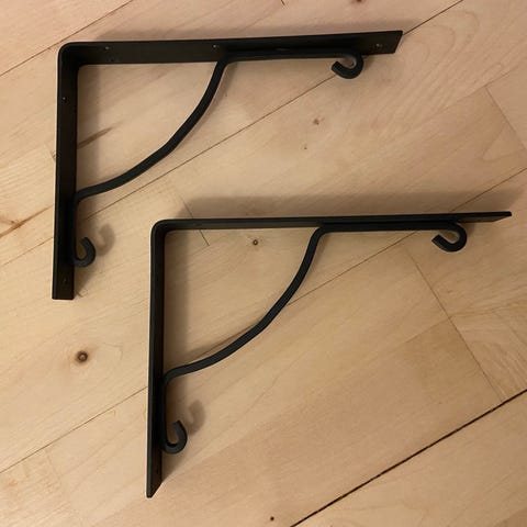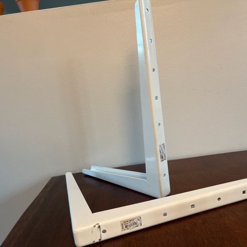 To råhvide hyldeknægte i metal med snoninger. Måler 17 x 23 cm og har 2x2 huller.