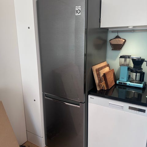 Point køle-fryseskab i cremefarvet finish. Modellen har et øvre fryserum med separat dør og et større kølerum med flere hylder og dørbakkker til opbevaring.