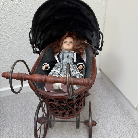 Dukke Barnevogn i rød træ. Barnevognen har en klassisk design med hjul og håndtag, velegnet til leg og opbevaring af dukker. Materialet er træ, og den er designet til børn ca. 40 år gammel.
