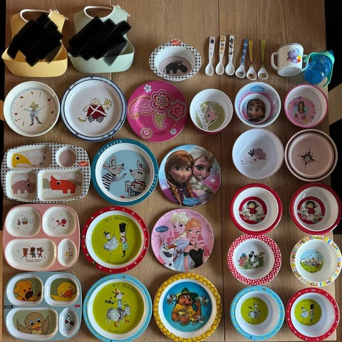 Helt nyt. Til de små. Dyb og flad tallerken og Legetøj (9 ting sælges samlet)