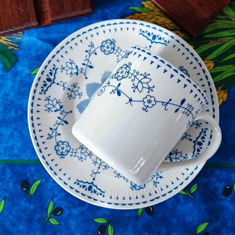 Porcelæn, Musselmalet kop sæt, Kalk, Musselmalet kop, underkop og kagetallerken. Kop 6 cm høj og 7,5 cm i dia. Underkop 13 cm i dia og kagetallerken 15,5 cm i dia. Samlet pris for sættet.