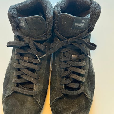 Puma sneakers i herrestørrelse 44. Skoene er grå og har en robust sål med mønster for godt greb. Materialet ser ud til at være en kombination af tekstil og syntetisk materiale, hvilket giver komfort og holdbarhed. Skoene har snørebånd for justerbar pasform og en polstret krave for ekstra støtte omkring anklen.