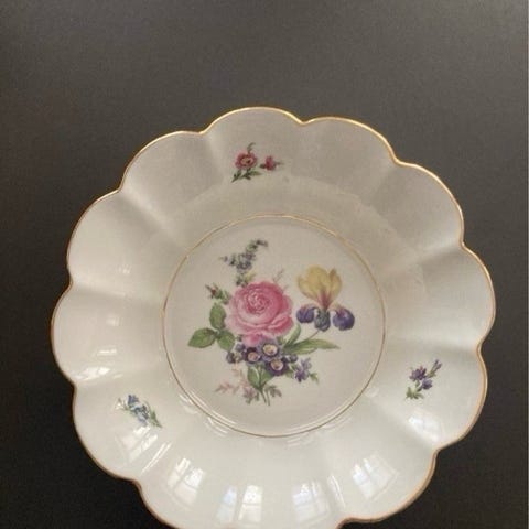 Fin gammel rødlig farvet skål på fødder 22 cm i diameter og 7 cm høj