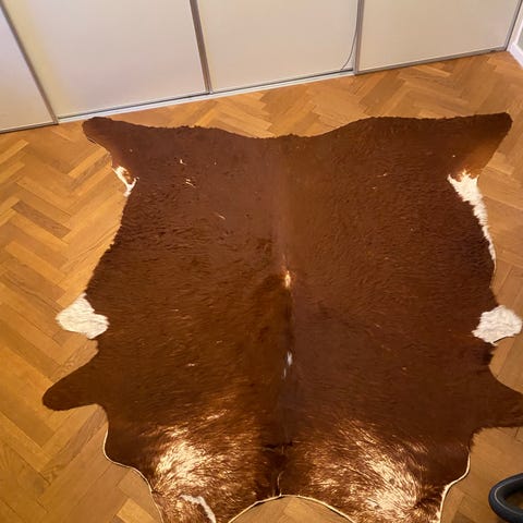 Jeg sælger dette fine ægte koskindstæppe. Det er fint og fyldigt i pelsen, trods mindre brugsspor. Det er ca. 200 x 200 cm.