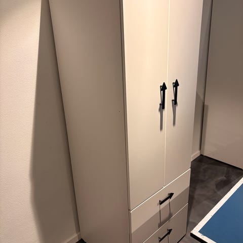 Den er i meget pæn stand, ingen synlige ridser eller skræmmer, kun de klistermærker der fulgte med skabet er sat på.