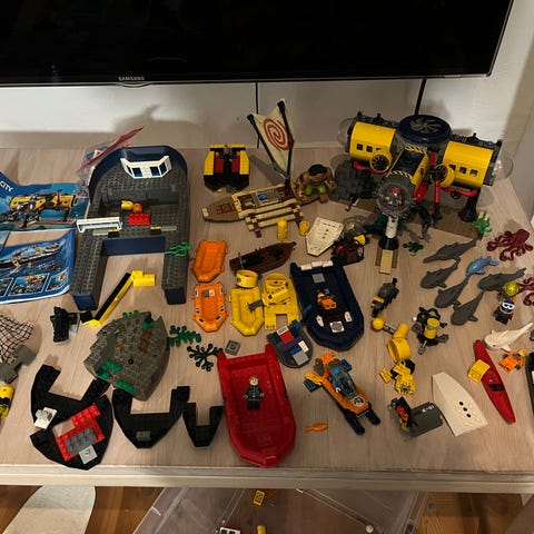 LEGO City Undervandsfartøj legetøj i gul farve. Modellen har bevægelige dele og detaljerede funktioner, der repræsenterer et undervandsfartøj. Fremstillet i plastikmateriale, egnet til børn og samlere. Der er også en haj og mand inkluderet. Der er instruktionsbog men ikke nogen kasse.