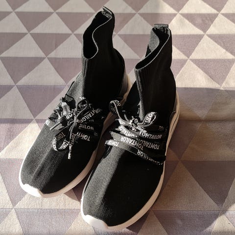 Et par flot snøresko. Lavet af økologisk læder og stof. Med foring. Der er "trædepuder" indeni, som gør det rart for foden at gå. Meget behagelige at have på.