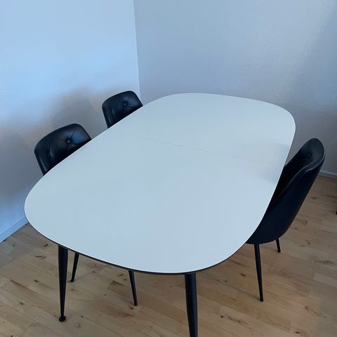 Fint spisebord. 160x 90 cm. Der er en udtræksplade til med lille skade på. Den er 40 cm. Bordet er 75 cm højt. Der er 4 skønne stole til.
