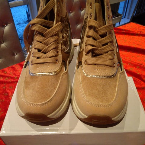Et par åndbar snøresko. Med lav profil, rund skospids og flad hæl. Fremstillet af læder og stof. Meget behagelig at bruge.