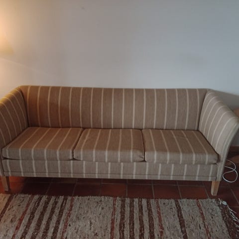 3 personers sofa fra 1970´erne i eg og med løse hynder. Formgivet hos Laboremus i Viborg. Fremstår pæn og ok velholdt dog med brugsspor på stoffet under hynderne. (Billede)