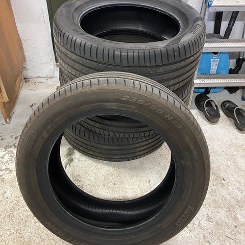 215 / 50 R 19 T. kørt max 3-4000 km. Den ene har haft et søm i kanten, og derfor kasseret?