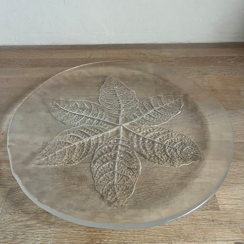 Detaljeret bladmotiv i glasset og siderne på fadet går lidt op