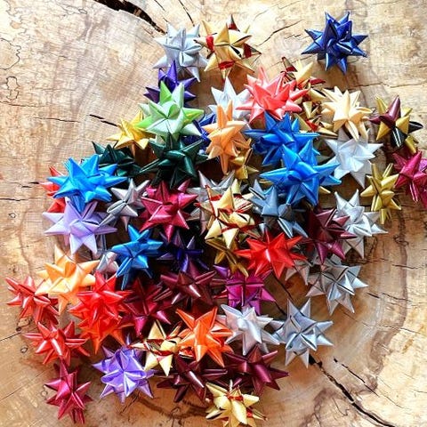 Flettede julestjerner i alverdens farver af 0,5cm gavebånd. Hjemmelavede.