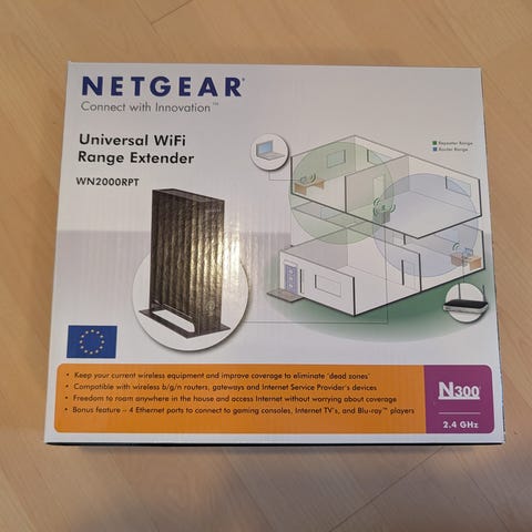 Netgear EX6100 WiFi Range Extender i hvid farve. En netværkskomponent designet til at forlænge rækkevidden af et eksisterende trådløst netværk. Enheden har porte til forbindelse og en tænd/sluk-knap samt mulighed for fabriksnulstilling. Den understøtter standard netværksfunktioner til forbedring af trådløs dækning.