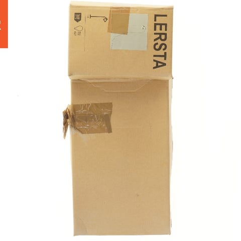 Denne er en gulvlampe fra IKEA, model Lersta. Lampen er pakket i en brun papkasse, der måler cirka 60x25 cm. Emballagen viser tydeligt IKEA-branding og modelnavnet Lersta. Lampen er designet til indendørs brug og er populær for sit minimalistiske design. Den anvender en standard lyspære, som kan udskiftes ved behov.