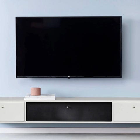 Hvidt TV møbel fra Mistral - med 3 hylder og to stoflåger, så fjernbetjeningen kan skyde igennem. De 3 rum samt top og bund er forbundet til nem kabelføring.