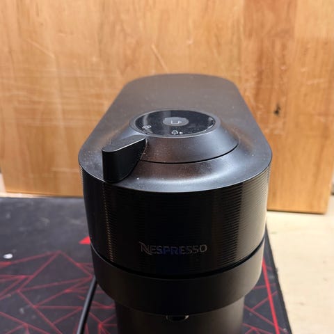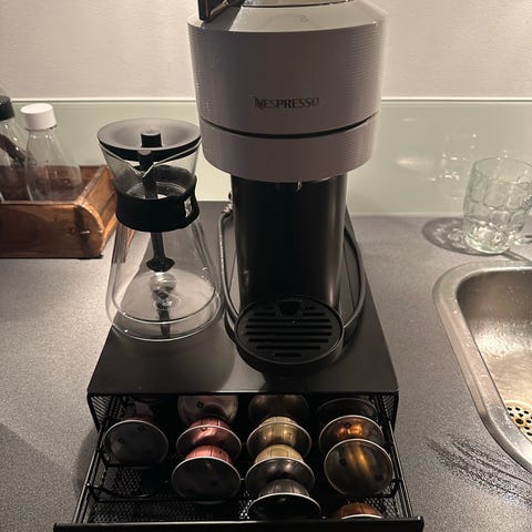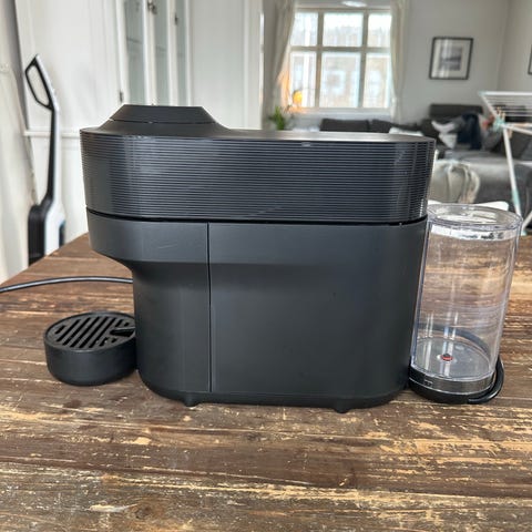Nespresso Vertuo kaffemaskine i sort farve. Maskinen har en kompakt størrelse og er designet til at brygge kaffe med Nespresso kapsler. Den har en integreret vandtank