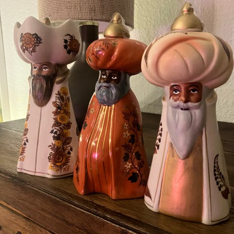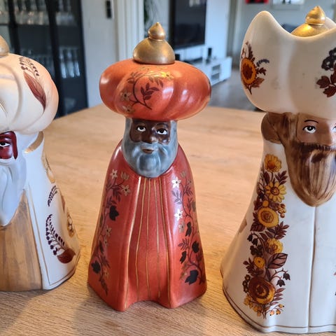 Balthazar og Melchior. De har en aftagelig guldtop, hvor man kan sætte et stearinlys. BALTHAZAR ER SOLGT. De er 22 cm høje, med original emballage og vejer i alt 1,5 kg. Sælges til fast stykpris + evt dao fragt.