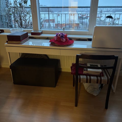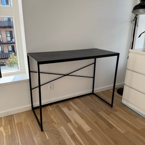 Elegant og enkelt skrivebord i lyst træ med et minimalistisk udtryk. Bordet har en praktisk skuffe til opbevaring af småting og passer perfekt til kontor, entré eller som konsolbord i stuen. Står i rigtig fin stand uden større mærker.
