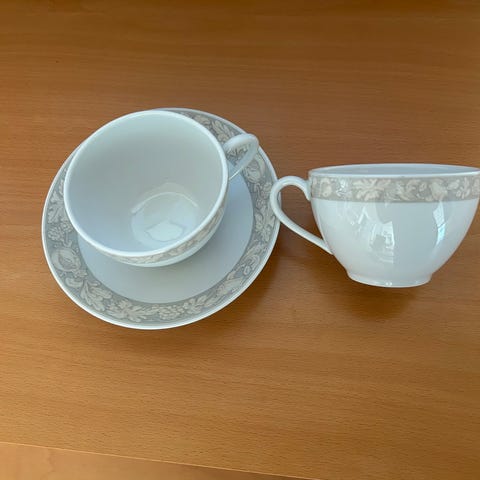 Pillivyut the-stel bestående af sidetallerkener, kopper og underkopper.