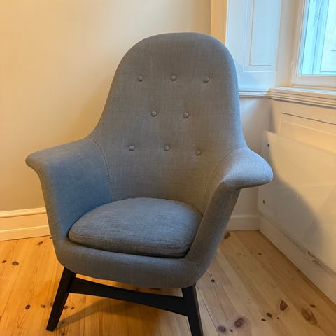 Lænestol i grå bomuld. Stolen har betræk i stof og en komfortabel polstret sæde- og rygdel. Velegnet til daglig brug i stue eller læsehjørne.