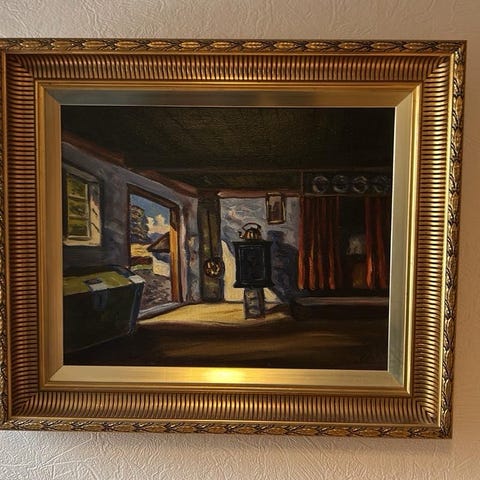 Maleri Interiør med Pejs og Vinduer