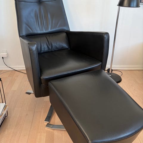 NASA høj lænestol i sort læder med vippefunktion + skammel i sort læder.
