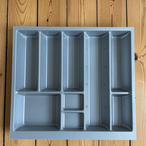 Plastik bestikbakke med flere rum til opbevaring af bestik og små køkkenredskaber. Farven er lys grå, og bakken er designet til at passe i standardkøkkenskuffer. Materialet er holdbart plastik, nem at rengøre og vedligeholde. 48×53,5 cm.