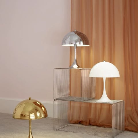 Den ikoniske lampe har den karakteristiske runde, kuppelformede skærm og den elegante, buede fod. Designet af Verner Panton og udført i materialer med en glat, hvid finish.