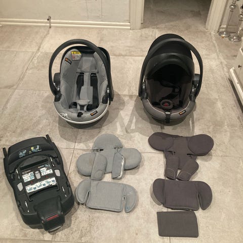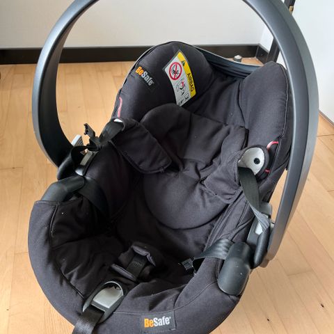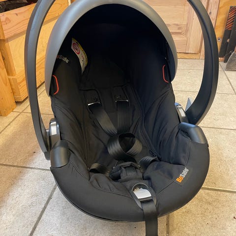 Betræk kan tages af og vaskes. Købt i 2022. Ingen uheld af nogen art - skal bare lige vaskes. Smart magnet som holder selerne fast når du skal tage babyen ind og ud. Der kan tilkobles en base for izofix (skal købes andet sted), men kan sagtens bruges med alm sele i bilen.