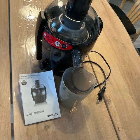 Philips HR1855 juicemaskine i sort farve. Maskinen er designet til at presse juice fra frugt og grøntsager. Den har en gennemsigtig beholder til juiceopsamling og en bred påfyldningsåbning. Maskinen er udstyret med en motor og et netfilter til effektiv juiceudvinding. Strømforsyning via ledning. Egnet til hjemmebrug til tilberedning af frisk juice.