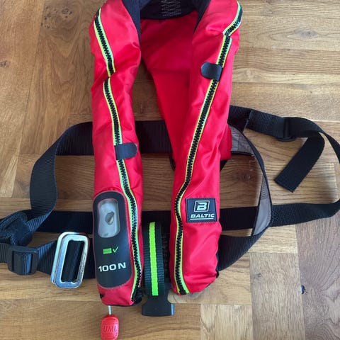Baltic redningsvest 20-50 kg med 100N og model compact harness med justerbare seler. Den har brug for ny patron før brug ellers fin stand