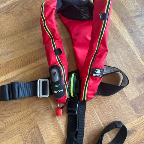 Baltic redningsvest 20-50 kg med 100N og model compact harness med justerbare seler. Den har brug for ny patron før brug. Selen man tager rundt om benet er skåret en smule op som vist på de sidste billeder, derfor kan man ikke benytte hele snoren og kun den længde som er vist på billedet.