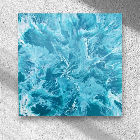 Abstrakt maleri med blå og hvide farver, udført i akryl på lærred. Maleriet har et moderne udtryk med flydende mønstre og teksturer. Velegnet til indretning af bolig eller kontor for at tilføre farve og visuel interesse.