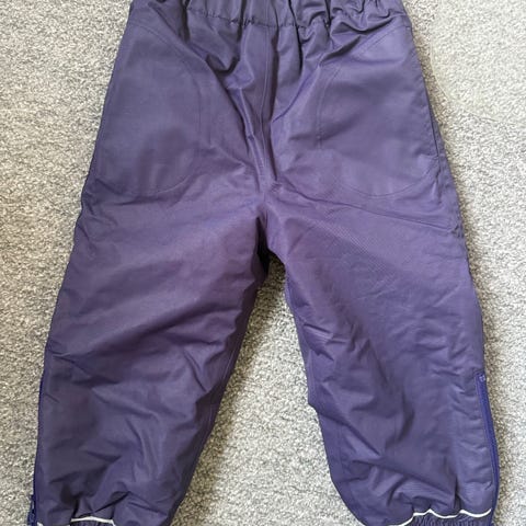 Flotte lilla skibukser fra caretec. De er lidt beskidte foran på knæene, men ikke mere end man kan vaske af. Ellers er de rigtig fine. INGEN HULLER. Kan evt bruges som ekstra par til børnehaven.