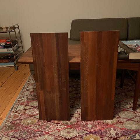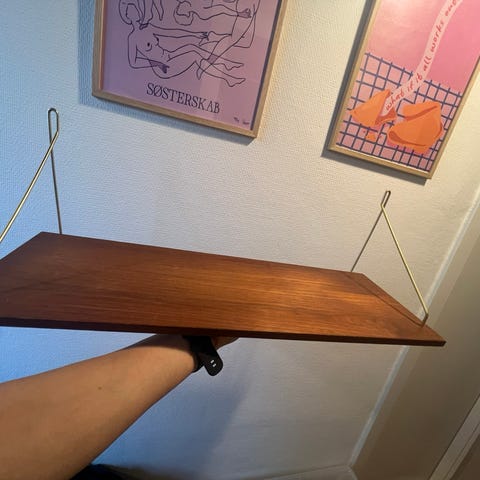 Hylder i teak look med sølv/metal hængsler. Har 3 stk