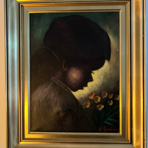 Originalt oljemaleri af en ung pige med langt hår, malet i varme farver. Portrættet er udført i en traditionel stil og indrammet i en dekorativ ramme. Velegnet til indretning og samling af kunstværker.