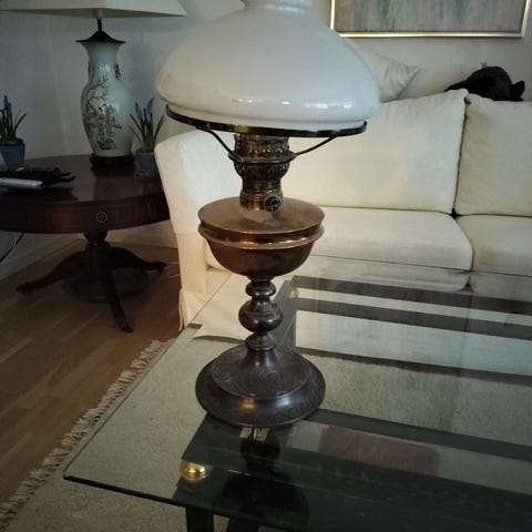 Tudse gammel petroleumslampe fra slut 1800 tallet, se billeder for stand.
