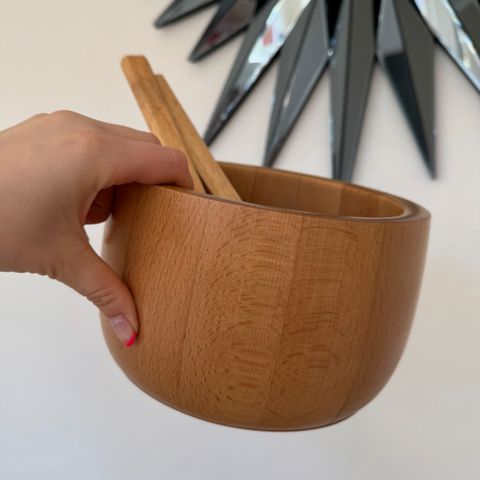 Salatskål i bøg, Måske Nissen.., Rigtigt lækker og gedigen salatskål bestående af skål m indsats til salat-Tang og i meget fin stand. Jeg kender hverken designer eller producent, men det minder en del om de salatskåle Nissen lavede.
