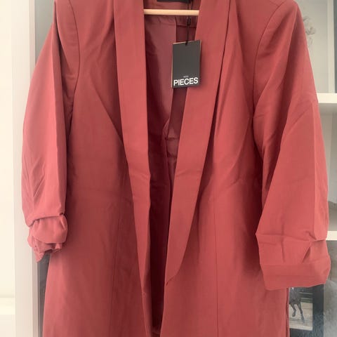 Blazer fra Pieces i blå farve, størrelse XXL. Jakken har en åben front uden knapper og 3/4 ærmelængde med opsmøg. Brugt én enkelt gang.