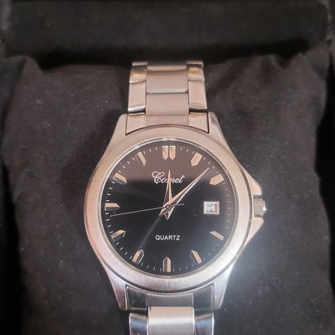 Det er blevet repareret med ny krystal, ny original krone og pakning i bagkassen, samt nyt batteri.
