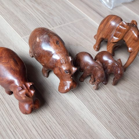 Charmerende flodhest i træ. Jeg er ikke klar over hvilken træsort, men ChatGPT foreslår teak eller en afrikansk mahogni-type (sipo/sapelli). Den har nogle afslag, bl.a. ved undermunden, og så gætter jeg på, at den har haft ører engang, men charmerede ikke desto mindre.