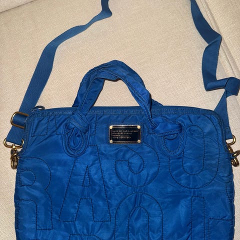 Marc Jacobs unisex taske i en lilla farve. Tasken har et mønster med bogstaver præget i materialet og en lynlås lukning. Indvendigt er tasken foret med et matchende materiale. Designet er enkelt og funktionelt, egnet til opbevaring af 15” computer eller mindre.