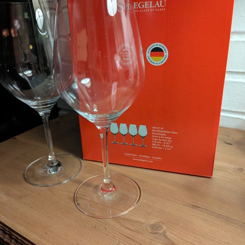 8 nye Spiegelau Capri glas, heraf 6 rødvinsglas og 2 burgundy glas. Nye i æske, aldrig brugt.