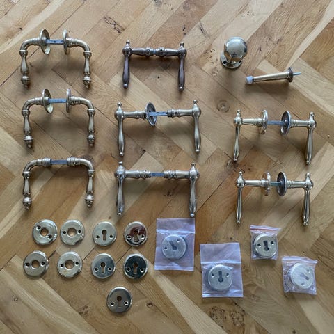 Solgt !! 6 sæt komplette Messing / træ dørgreb med alle skruer