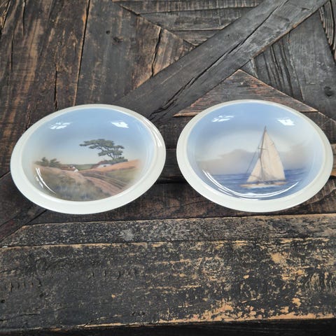 Royal Copenhagen 'Dødshammer' og 'Rundetårn' keramiske platter med blå og hvide motiver. Platterne viser detaljerede landskabs- og bygningsscener, herunder Dødshammer og Rundetårn. Fremstillet i keramik med traditionel blå-hvid farve. Platterne leveres i original emballage med beskrivende tekst på bagsiden.