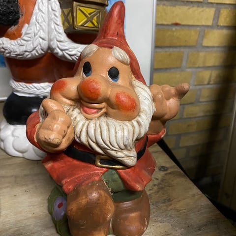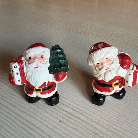 3 ældre nisser der laver sjov. Den der står på hovedet er ca 9 cm høj - de andre er ca. 7 cm. Sælges samlet.