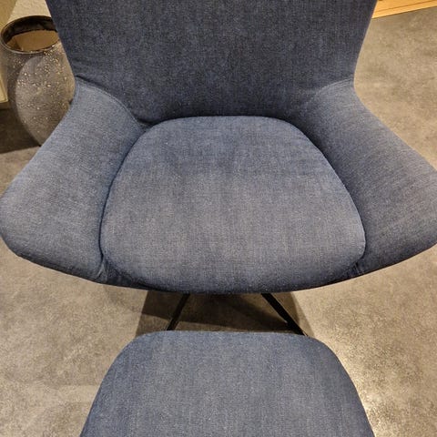 Stor behagelig lænestol med puf. H 1 meter L 80 cm. Den er slidt men lækker at side i.stolen er fra Hjort Knudsen pris 500kr